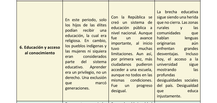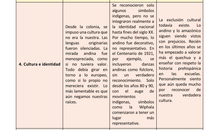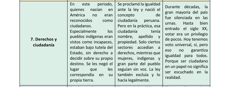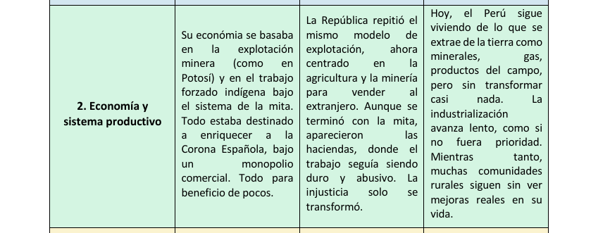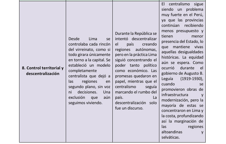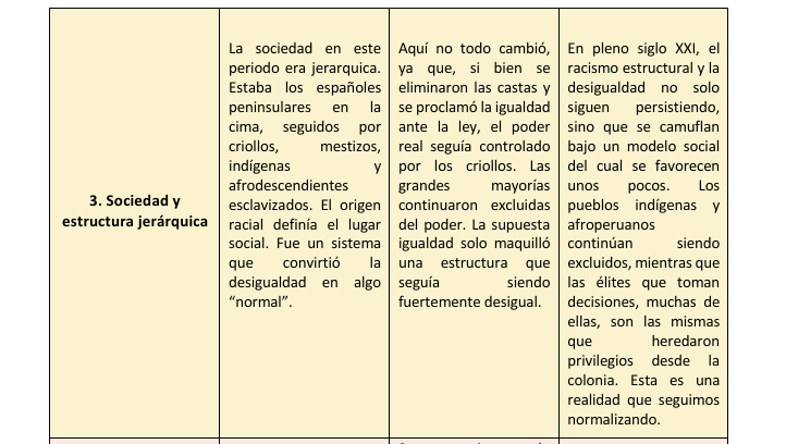 Al analizar la historia del Perú, hemos podido identificar que, aunque el país atravesó cambios importantes, muchas de las desigualdades y estructuras de poder del pasado siguen presentes en la actualidad. Este trabajo comparativo nos ha permitido reflexionar sobre diversas áreas como el gobierno, la economía, la educación, la cultura, la religión y los derechos ciudadanos. Si bien la independencia representó una ruptura con el dominio colonial, en la práctica muchas formas de exclusión continuaron bajo nuevas apariencias. A través de este análisis, llegamos a la conclusión de que entender nuestro pasado es clave para cuestionar lo que aún debe transformarse y para valorar los avances que se han logrado como sociedad. Solo reconociendo tanto los cambios como las permanencias podemos imaginar un país más justo e inclusivo para todos.